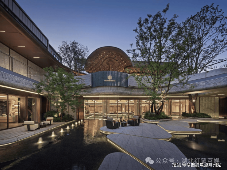 园林以"长江揽胜,琢玉之境"为理念,融合国际度假酒店的松弛感与都会奢华酒店的精奢美学,打造六大主题场景。核心的"玉瀑鸣涛"垂直水景,以4米高叠瀑点睛下沉庭院的视觉焦点;樱花玉廊对望亭内,青玉格栅屏风与和氏璧纹样地面相映,演绎"玉影浮光"的东方意境。在这里,归家即是度假,下楼即是风景。