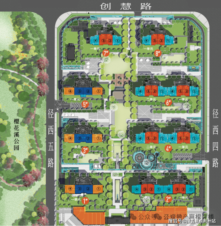 从平面图来看,该项目地块非常的完整方正,且所有楼栋几乎都是正南北朝向,全部楼栋都是规划的1梯2户,包含建面约77-106平房源。