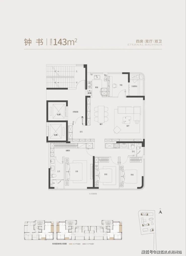 招商紫荆府户户都带有电梯前室,建面约143平的边套户型做的是三面采光,带有东西向的大横厅和阳台,三个房间朝南,主卧大套房超绝,带有较大的封闭阳台优化面积,主卫也是南向的。