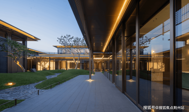 循光步入“归心林庭”,脚步不自觉慢下来:蜿蜒石径嵌在起伏的草坡间,矮松与灯带晕染出朦胧暖意,玻璃连廊的光影随步履流转,风穿过枝叶的轻响裹着草木香,将外界喧嚣层层滤去,幽雅如隐入江南旧梦。