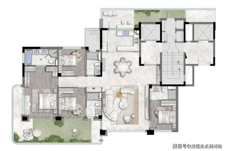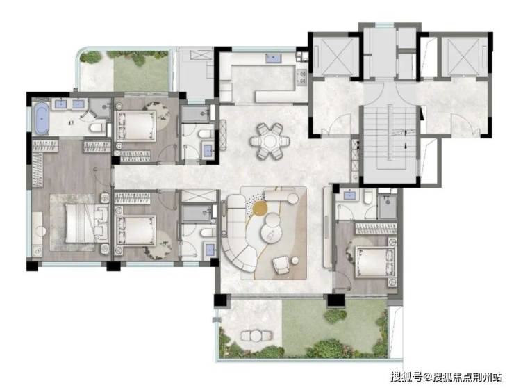 此外, 通过「内退」与「外突」的立体设计手法,有效避免了与偶数层户型的视线对视,显著增强了居住的专属感与私密感。