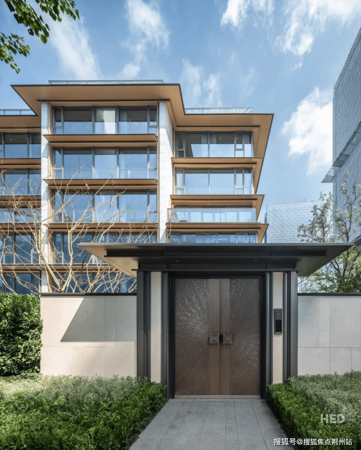 材料选择:立面选用3mm厚淡香槟金铝板与晶白美国白金花岗岩石材组合,首层全石材干挂,配套用房采用石英石,南向立面采用三玻两腔玻璃系统,保温隔热性能较普通中空玻璃提升40%。