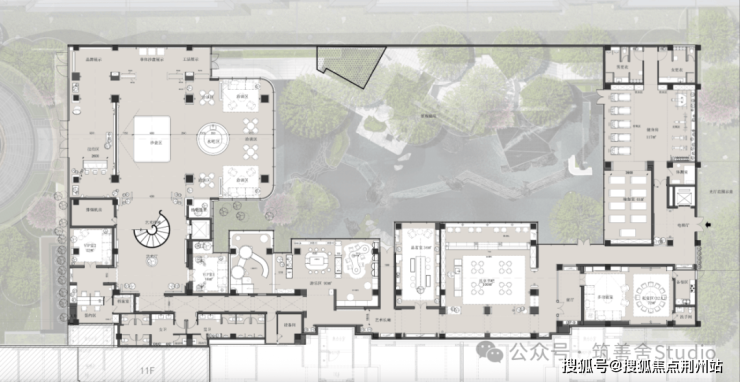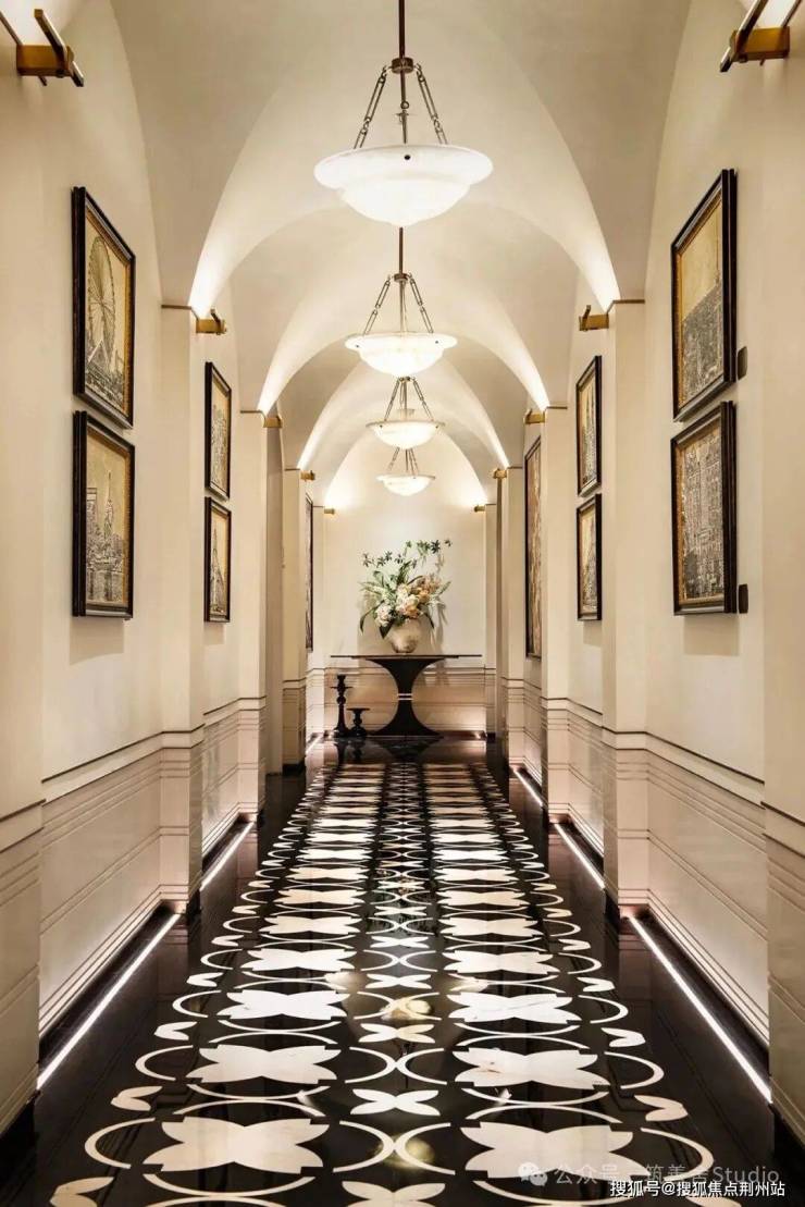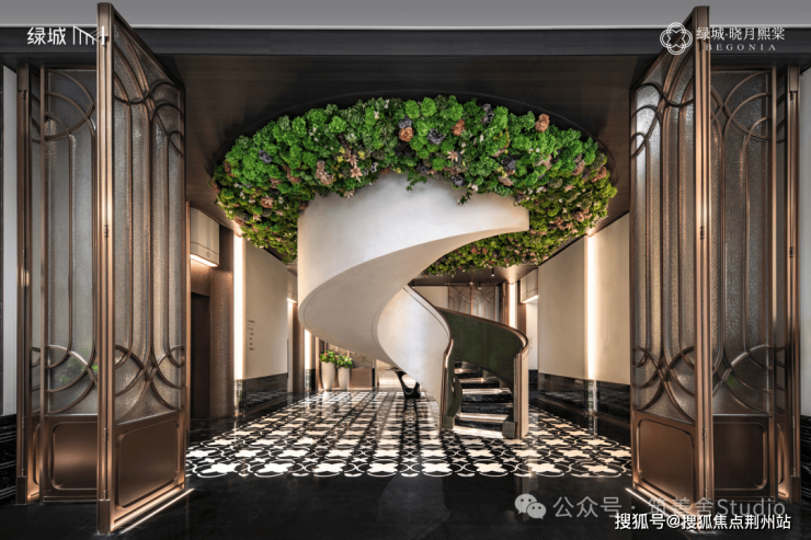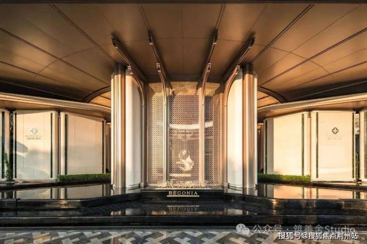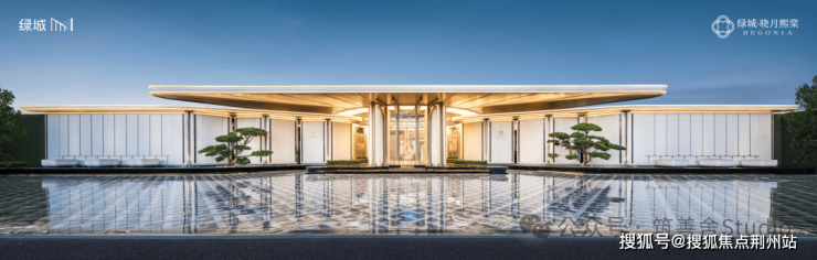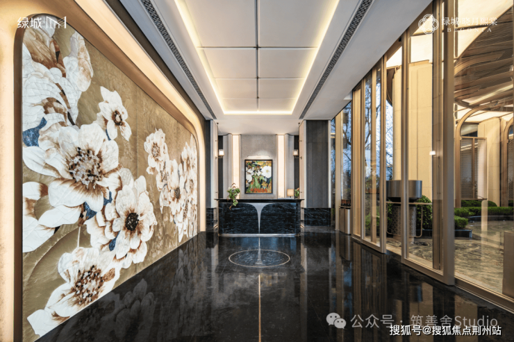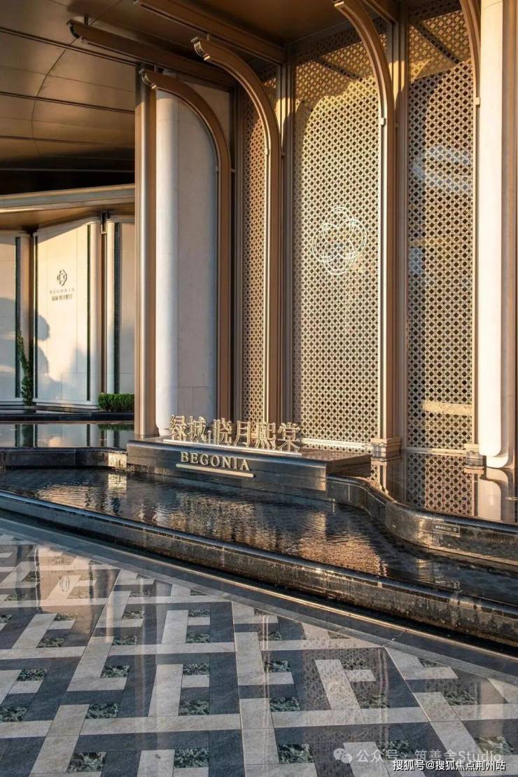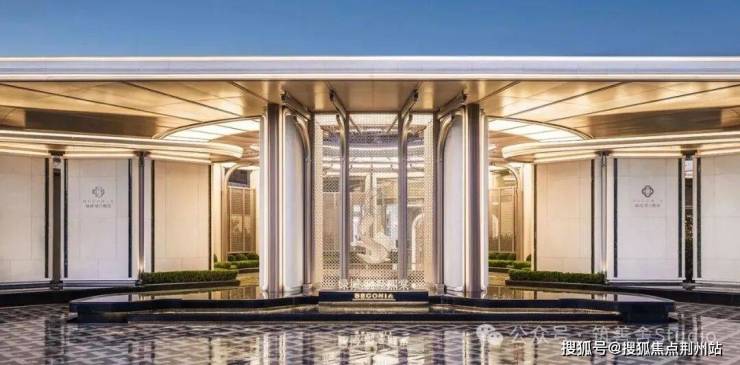 首先映入眼帘的是一座约60米长的壮观门庭,其碧波荡漾的叠水景观与挺拔的迎客松相得益彰,营造出非凡的气势与意境,彰显归家的尊贵礼仪。地面采用橄榄绿与星河灰的精致拼花设计,点缀以叠水景观,两侧迎客松更添福瑞庇佑,使得归家之路尽显非凡气韵。