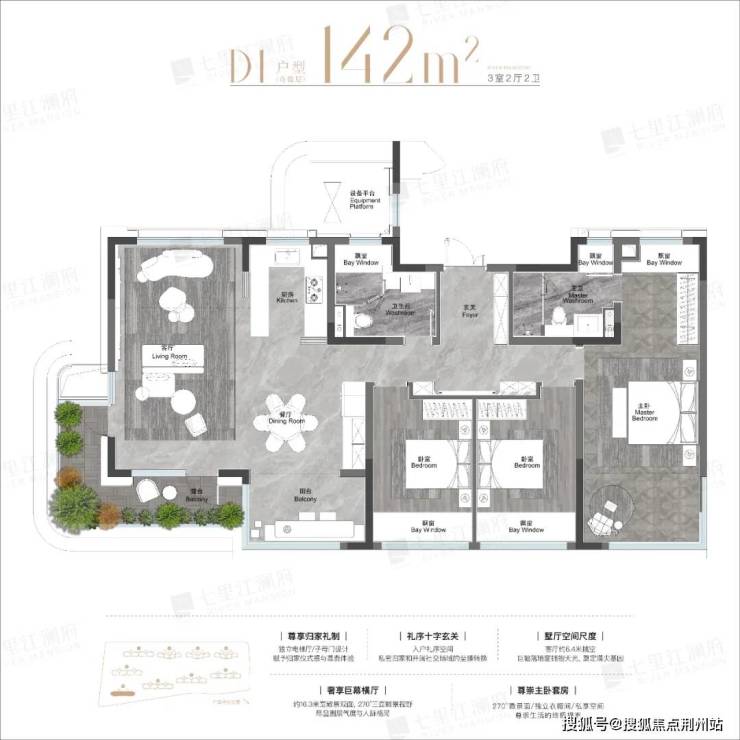 另外,还有建面约114㎡三房两厅两卫户型,是三房户型里更舒适版——四开间朝南,南向超12米南向景观面,一线瞰河。值得关注的是,这个户型延伸了更多空间,非常实用。比如独立家政间,巧妙化解家政收纳;全飘窗设计,既放大视觉体验,又将高附赠率拉满。无界横厅设计,可以设置成多个多功能空间,全方面满足家庭成长需求。主卧大套间,带有独立卫生间,270°观景面,比起102㎡改善尺度更大。露台做了主卧空中花园,不占用阳台的独立功能。