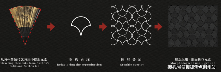 地面拼花图案提取传统苏扇形态,传统纹样与现代工艺结合的做法,体现"古意新作"的设计哲学;
