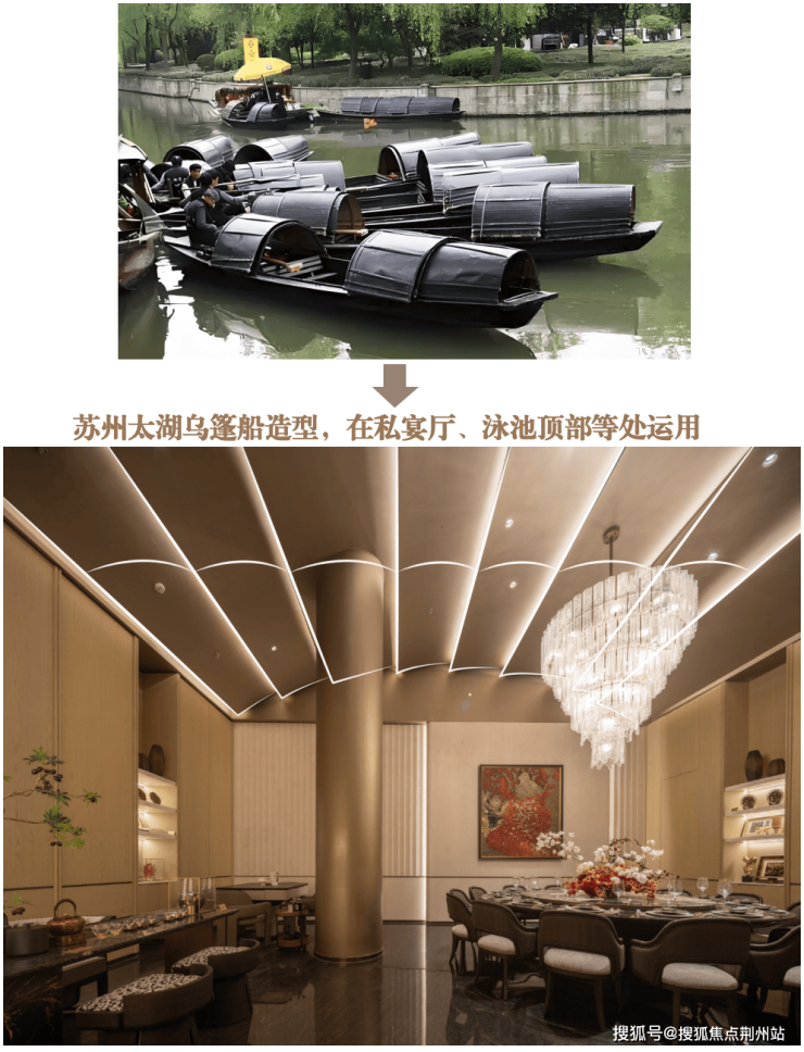 从商务私宴厅到运动空间等,顶部乌篷船,四周水波纹造型处处可见,仿佛太湖水韵流动于空间之中。