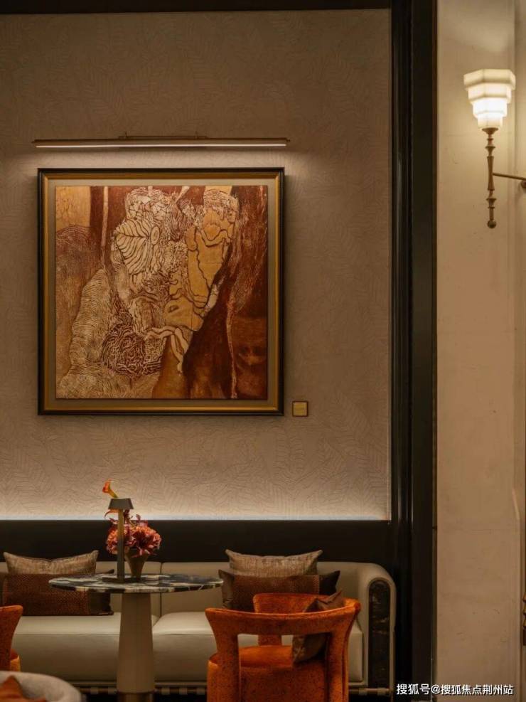应麦可抽象艺术挂画彰显磅礴的肌理与流动的色彩,与之辉映的是非遗金属抬凿錾刻技艺装饰画,匠人以锤代笔,以錾代墨铸就。现代与传统共鸣,为空间注入深邃的美学灵魂。
