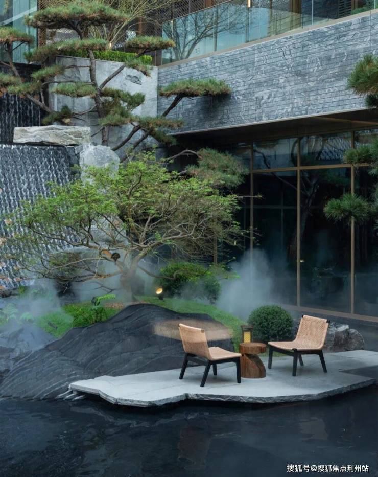 以超5米的鎏金龙鳞跌瀑为视觉焦点,水声轰鸣,打破静界,黑松、羽毛枫与拙朴山石错落其间,叠石成山,以现代笔法写意“丘山”。