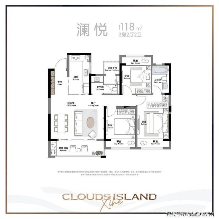 118㎡户型,三房两厅两卫,北面房间稍大。