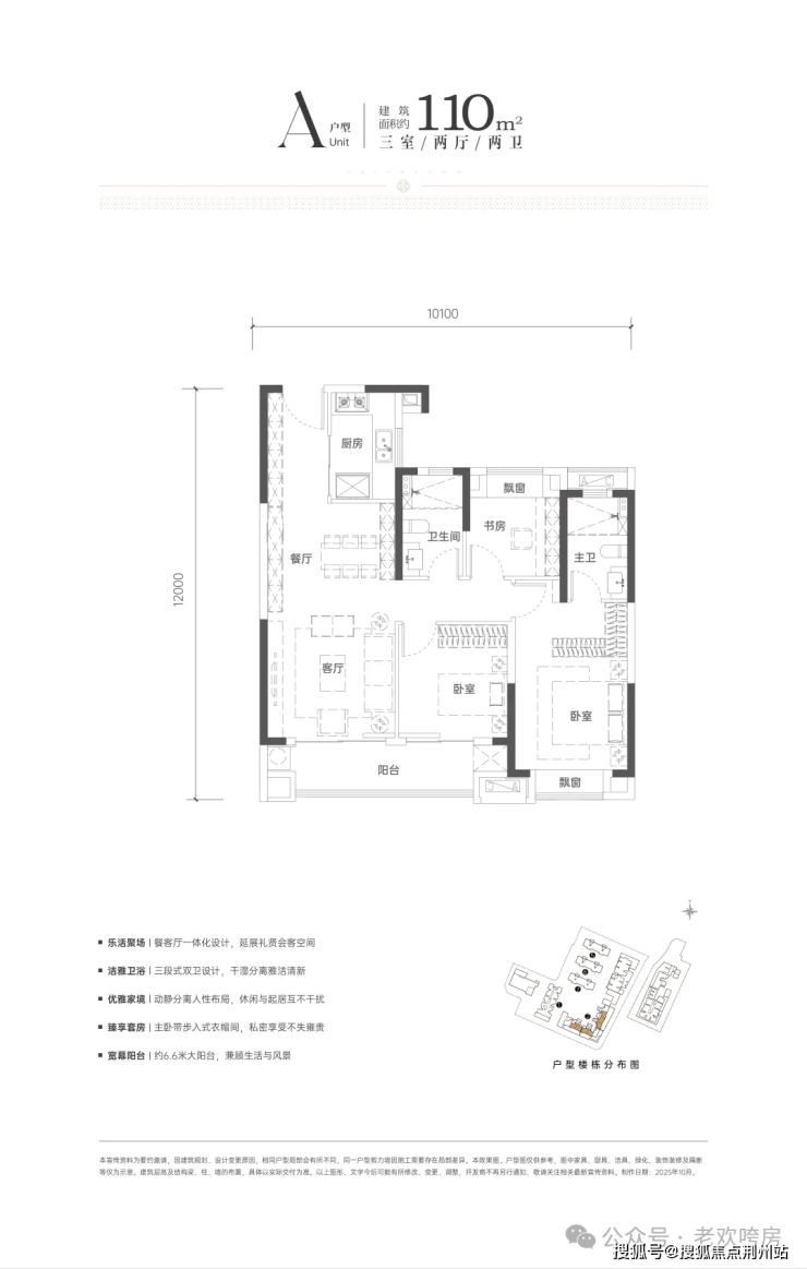 该户型南向开间达约10米、三开间朝南、南向跑道式阳台、主卧和书房都带有飘窗。