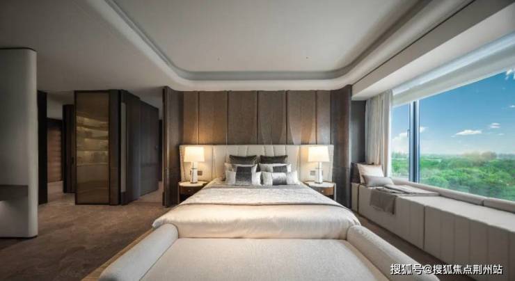 约44.5㎡总统套房主卧,演绎空间精奢学的优雅形态。约6.8米的瞰景飘窗,让视野更加开阔,阳光与清风肆意流淌。主卧还预留了L型漫游式衣帽空间,满足主人对衣物收纳与时尚展示的需求;独立卫浴间匹配双台盆、浴缸,为生活献上一份惬意与优雅。