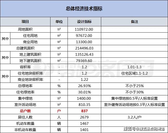 项目总用地面积110972㎡,总建筑面积214496㎡,住宅部分容积率仅1.2,总户数837户,机动车总停车位1467辆(包含110个商业车位)。