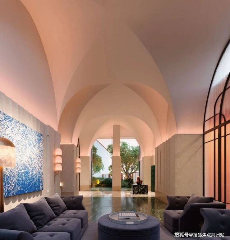 从九龙路起步,在繁花水岸的滨水步道上漫步归家;归家之路在滨水艺境另一侧,是约7000㎡的沉浸式邻里风貌街区,融合党群服务与邻里综合体业态,可在归家路途中感受精致烟火气;之后抵达九龙路归家主入口的河岸艺术大堂,两条地上细分动线,藏着不同的归家意趣:一条从主入口艺术大堂步入,沿着风雨连廊穿越花园小径,光影透过叶片洒落脚边,风携花香漫过肩头,仿佛逛完一场印象艺术展;另一条则经风雨连廊直抵“艺术品展列空间”泛会所,或许邂逅正在展出的私人藏品,在艺术氛围中完成圈层身份的过渡。最后步入电梯厅,半圆弧形天花吊顶暗合“天圆地方” 东方哲学,让归家终拾恢弘而宁静的仪式感。