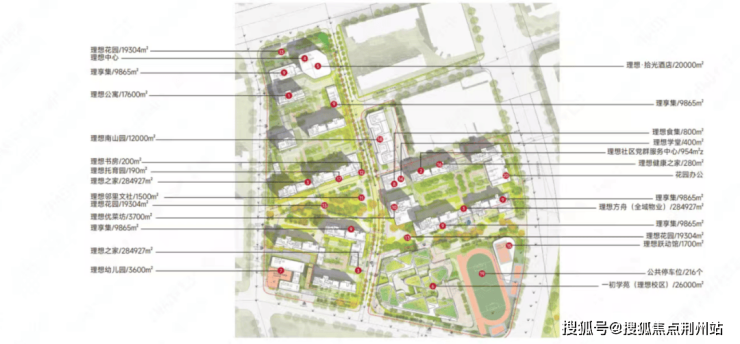 从规划图中可知,项目共包含13栋住宅、1栋写字楼、一所42 班九年一贯制学校、一所12 班幼儿园,还有运动场、康养中心、活力商业…… 连书店、食堂、优菜坊、运动场、健康之家都配齐了。