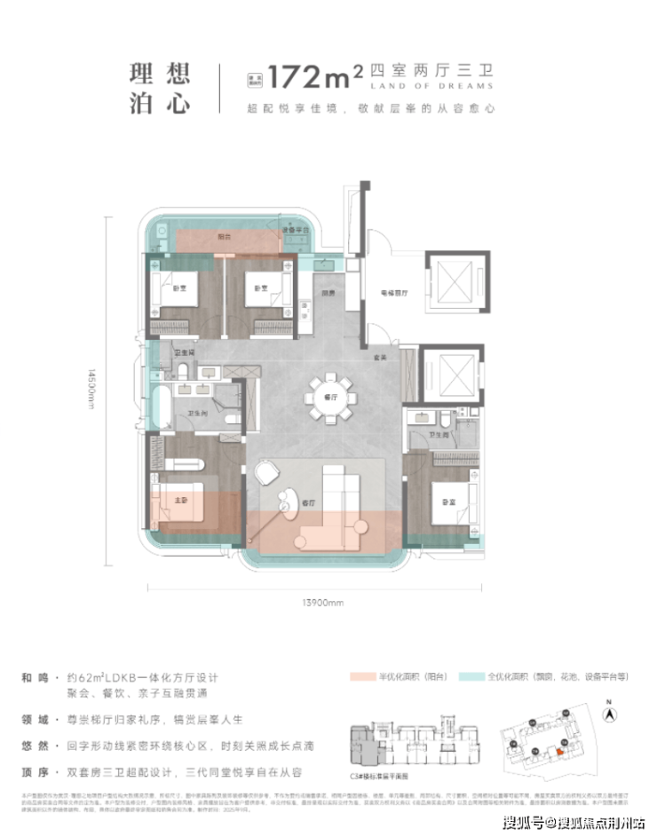 建面约172㎡四室两厅三卫户型,则为多代同堂或注重私密的家庭设计,