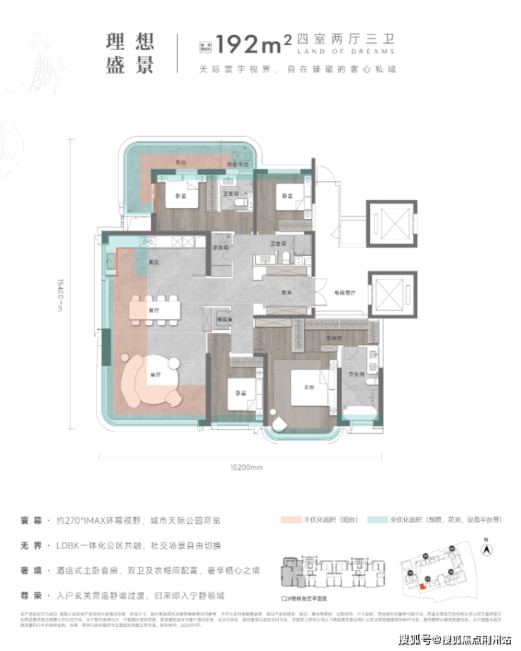 四开间朝南,南向面宽达15.2米,同样LDKB 一体化设计,社交空间更开阔,更有约270°IMAX环幕视野,城市天际公园尽揽,