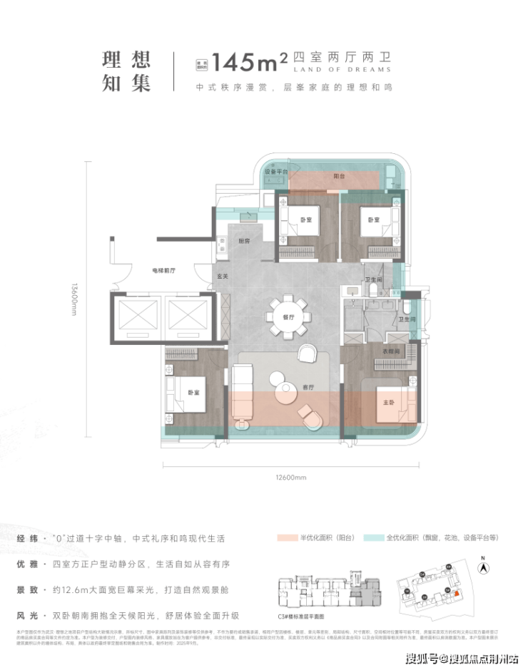 建面约145㎡的四房两厅两卫户型,走的是“平衡高效”路线。