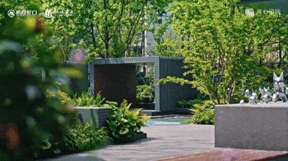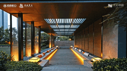 小区园林C位打造了“曲岸林歌”,由四级叠水组成中央水景,有叠泉缓流、有水涌若轮、有碧波粼粼,这里设置了三个冥想茶座,还有阔气廊庭,更搭配9扇金丝夹绢玻璃屏风,供业主休憩。树+水+居,在这里巧妙融合,妙哉。