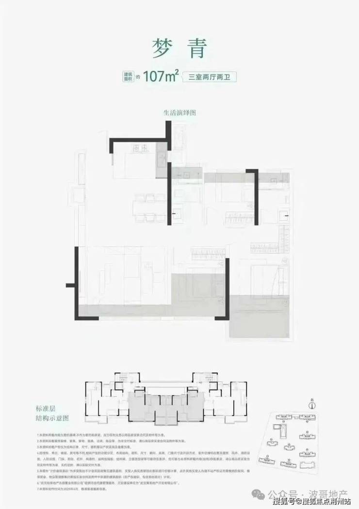 107㎡三房两厅两卫(梦青):此户型分布在1/2/3/6/7/8号楼的中间户型,北向常见连廊结构连接;三开间朝南、动静分区设计;户型整体呈现大开间小进深,即宽(开间)约11.1米,深(进深)约8.7米(前后有突出,此为综合深度);客厅开间约4.8米、客厅预留冰箱位置方便收纳;综合得房率约93%,不带花池露台,阳台连接主卧交付时统一封窗。
