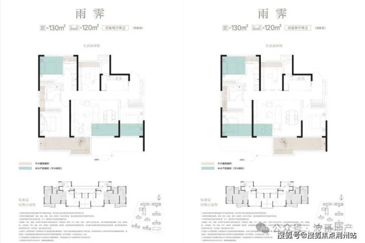 130㎡四房两厅两卫(雨霁):此户型分布在1/2/3/6/7/8号楼的东/西两端边户户型,户型整体呈现大开间小进深、即宽(开间)约12.8米,深(进深)约12.1米;三开间朝南、客厅开间约6米;奇偶层不同主要在南向主卧是否连接露台,露台部分无法封闭;综合得房率约97%。