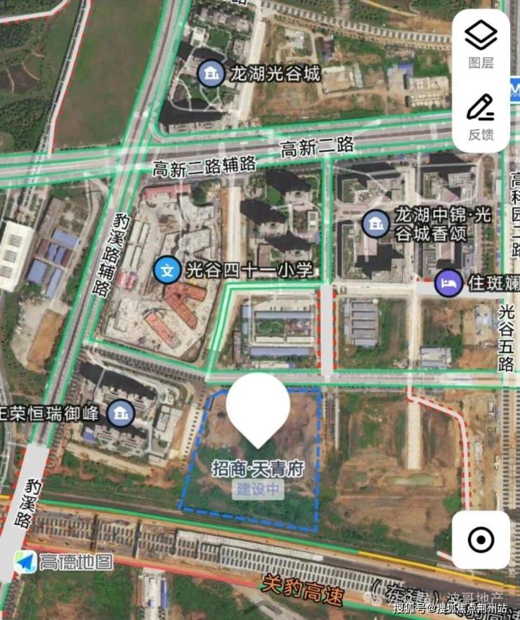 项目四至:北侧光谷四十一小、龙湖中锦光谷城香颂、神墩五路等;南侧为关豹高速;西侧正荣恒瑞御峰等;东侧为规划商业用地。