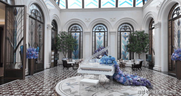 穿过大堂随后是大气的中央会客厅,空间顶部是由彩绘玻璃组成,这样光线照射进来会呈现出更柔和的质感,同时墙面上刻有浮雕,拱门也做了艺术化处理,与外滩的和平饭店有异曲同工的感觉,未来可以作为业主搞社区活动的场所。