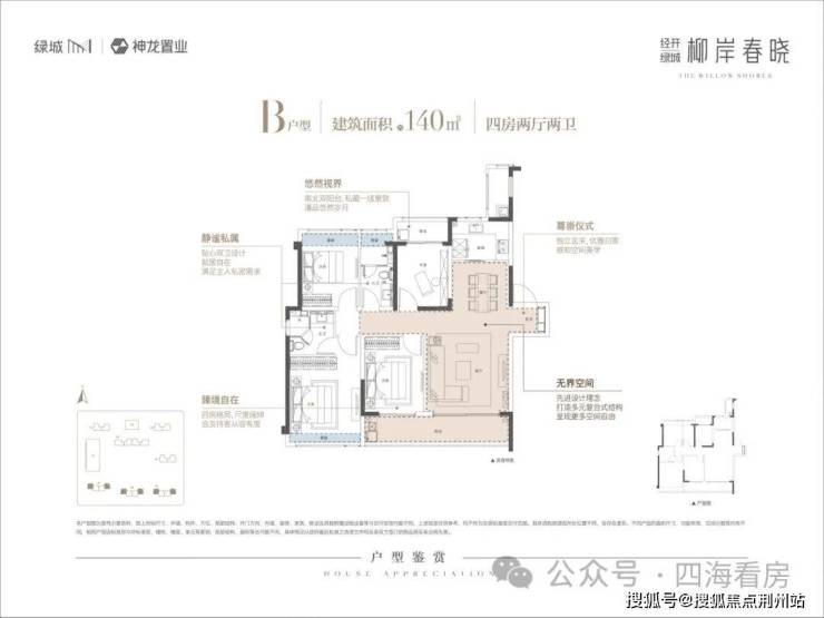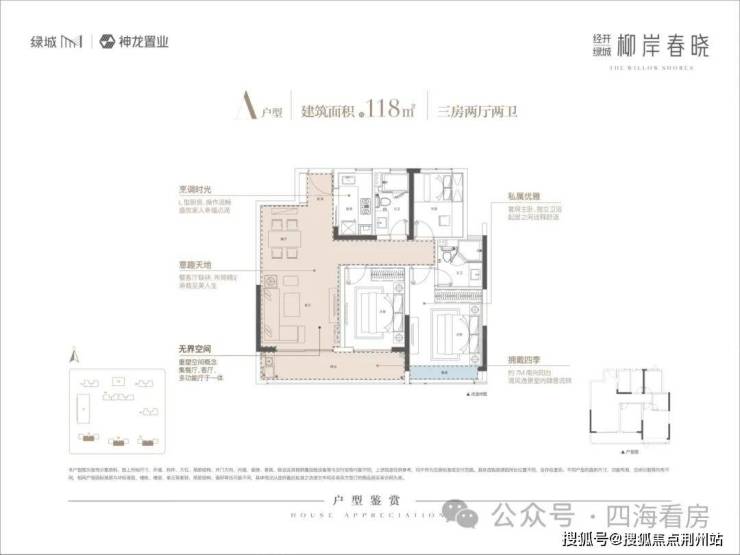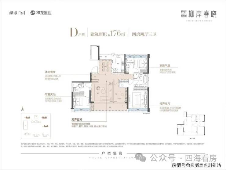 经开绿城·柳岸春晓:主推118-140-176-228平米精装修房源,折后均价约17000元/平米。