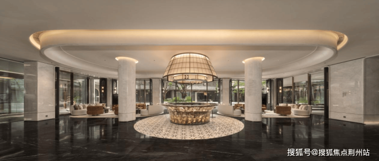 约60米宽、约6米挑高的尊崇门庭,以三进式礼序布局层层递进的仪式感归家动线。法国宝格丽黑石材环岛水景,呼应"龟蛇锁大江"的地理脉络;两侧对称列植名贵铁冬青,寓意"万子千红、家业兴旺";巴西碧潭金沙台阶与安哥拉黑石材叠水相映,象征"步步高升、财源广进",赋予“聚财”、“纳福”、“升贵”的美好祝愿。