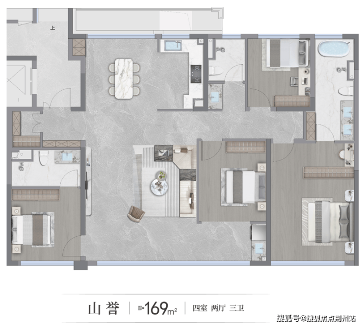 建面约169㎡洋房户型,充分彰显尺度与仪式感。配置独立家政间与立体收纳系统,彻底解决家务与储物烦恼,同时实现双套房设计,保障家庭成员居住私密。