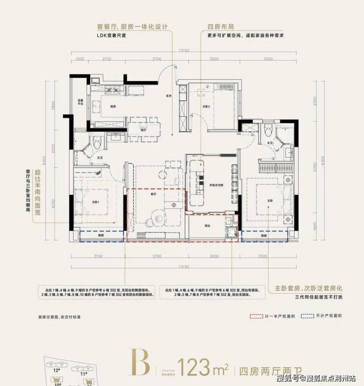 ❸高层建筑面积约123㎡户型,4房2厅2卫,含赠送得房率约90%。