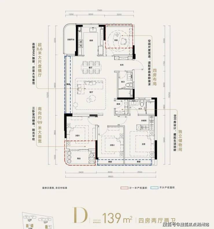 ❶高层建筑面积约139㎡户型,4房2厅2卫,含赠送得房率约92%。