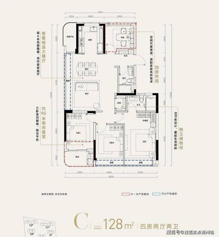 ❷高层建筑面积约128㎡户型,4房2厅2卫,含赠送得房率约93%。