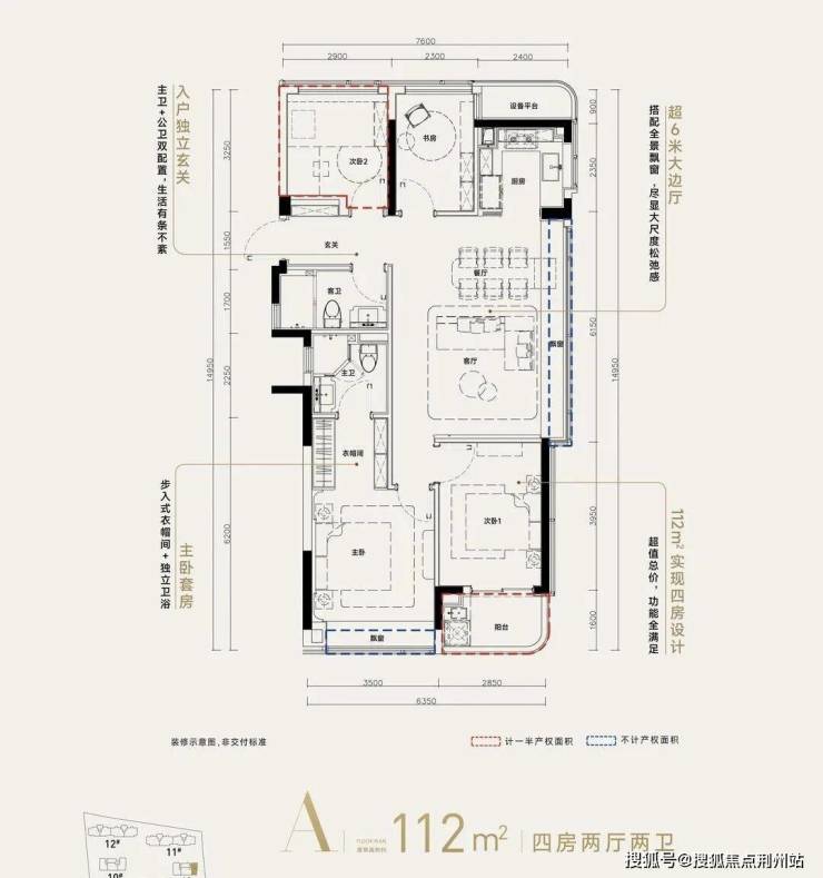 ❹高层建筑面积约112㎡户型,4房2厅2卫,含赠送得房率约92%。