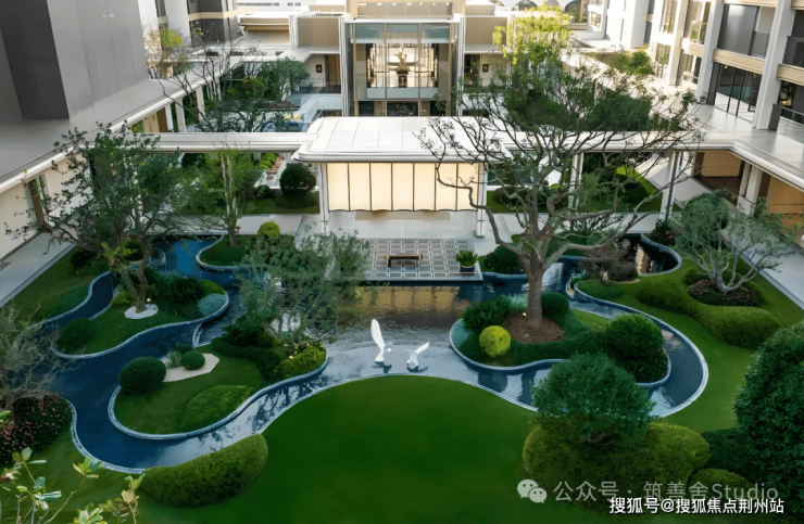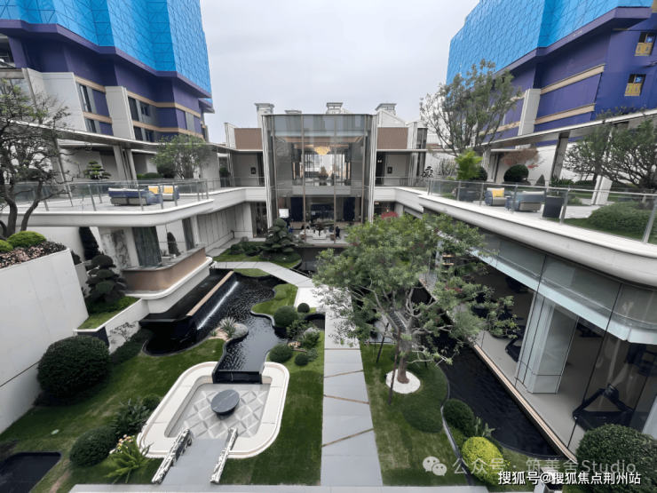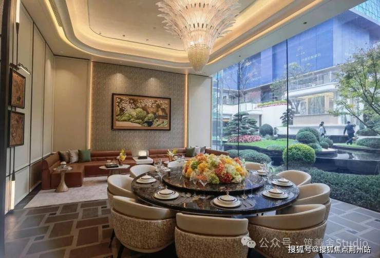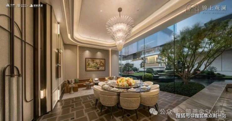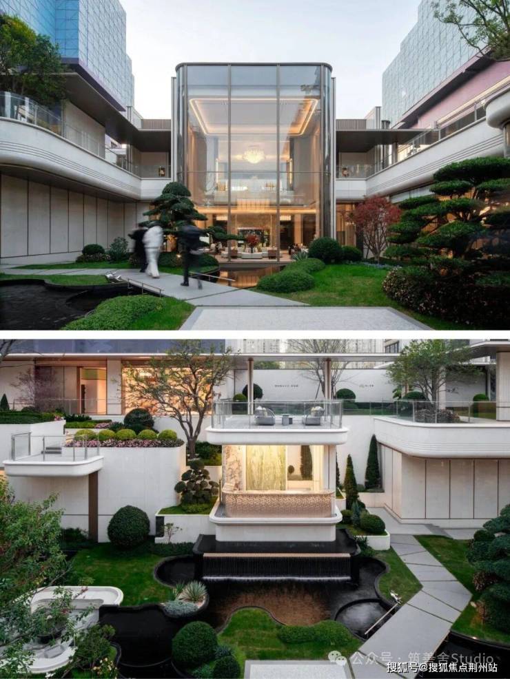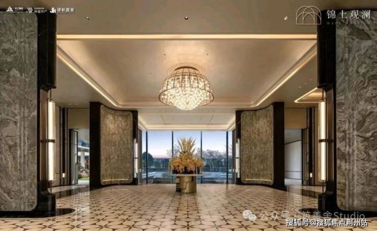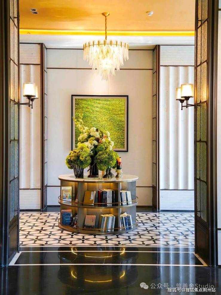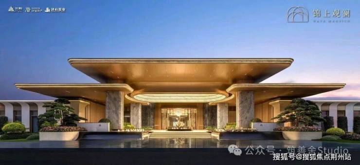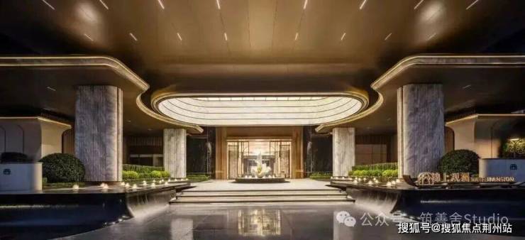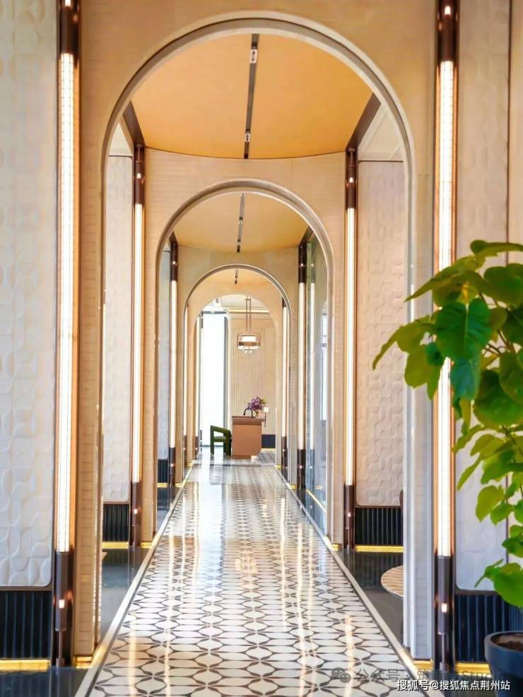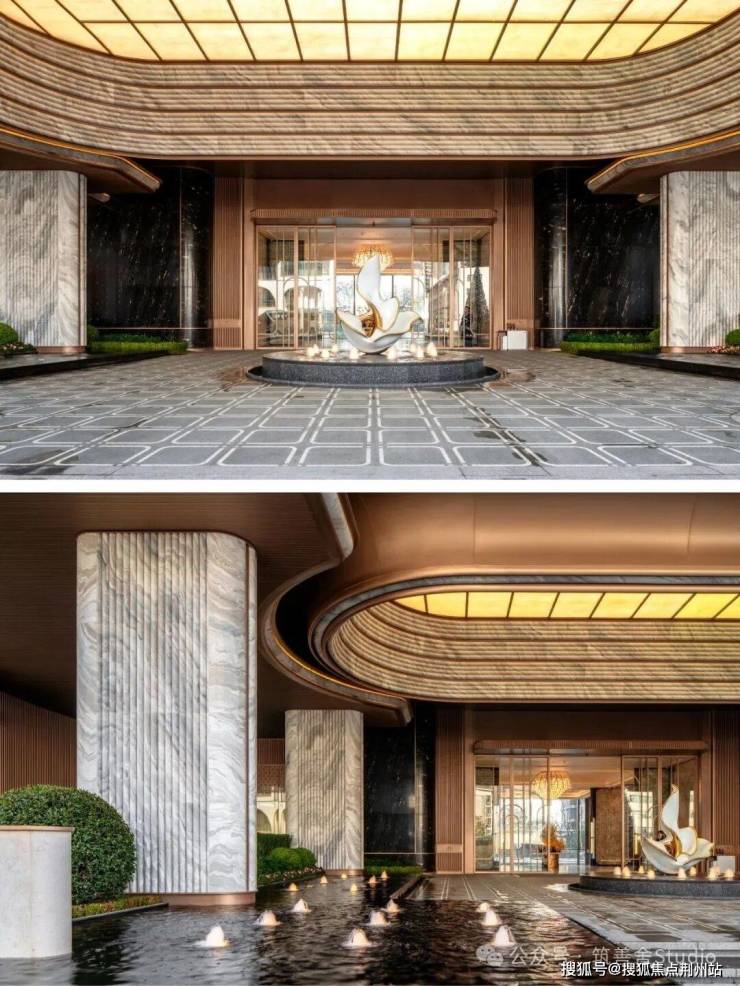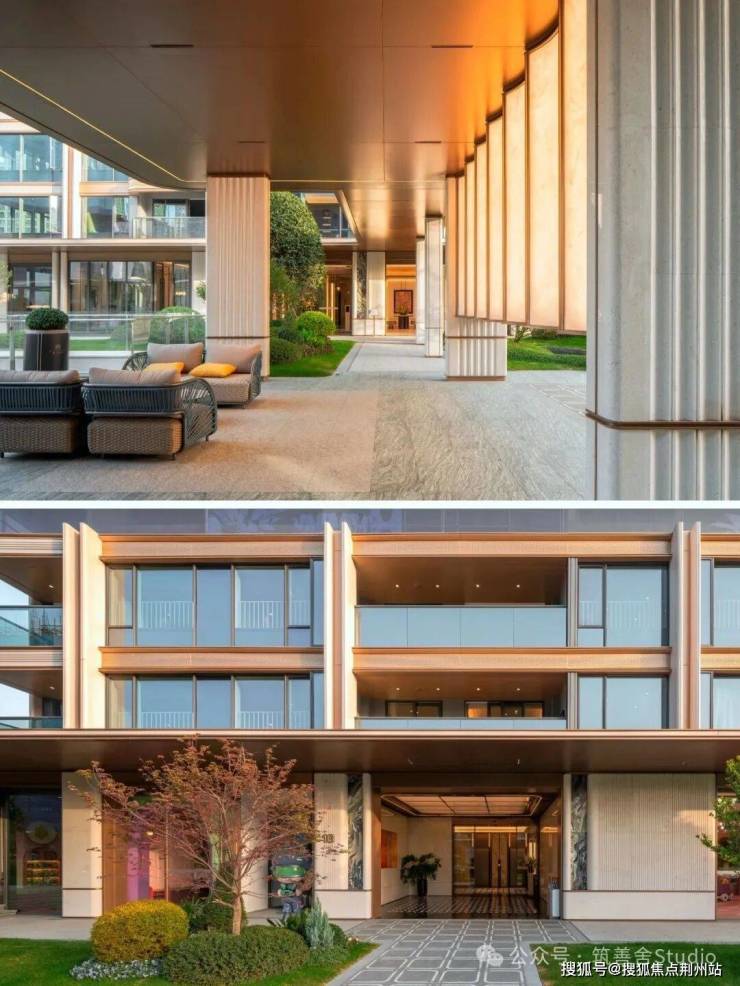 小区大门为宽约78.8米、高约9.2米的宏伟大门,采用与奥映鸣翠同款的梵高白石材,温润大气,搭配古铜色铝板,既显古典韵味又不失轻盈。传统建筑穹顶元素经过现代化演绎,夜晚灯光亮起时,化作金碧辉煌的藻井。融入水景、艺术雕塑与珍贵植物,建筑与景观在此合奏,成为整条街的璀璨门面。