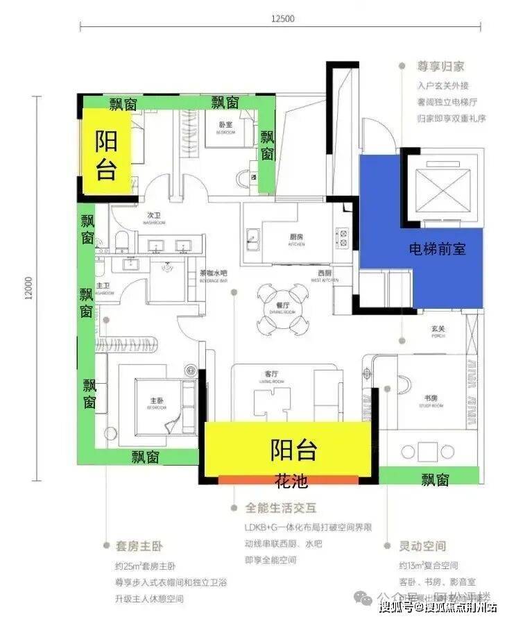 如果你预算在300万以下,可以买127平略小一点的户型,也是全盘唯一的小户型,四房两卫,两梯两户,有独立入户电梯,南向客厅大阳台外带花池,主卧和北向次卧双面飘窗,堪比传统三代住宅约150平的套内空间。