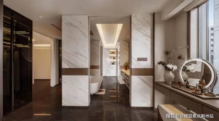 最大的主卧套间足足有55㎡,相当于把酒店行政套房搬到了家里。超豪华衣帽间,配置了男女主分开收纳区和化妆台;卫浴间用了高奢酒店同款双台盆和大浴缸;卧室全景落地玻璃窗。
