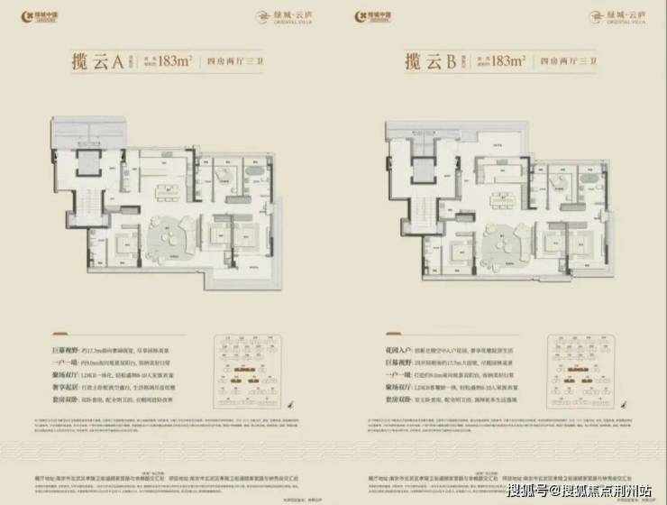 ・183㎡四房:南向面宽约17.7米,视野开阔。偶数层配备超大电梯厅及双入户门,仪式感十足。