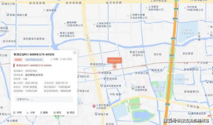 2025年9月4日,上海七批次土拍中,宇诚集团以总价27047万元,竞得青浦区QPC1-0009单元75-04地块,该地块成交楼板价15505元/㎡,溢价率0%。