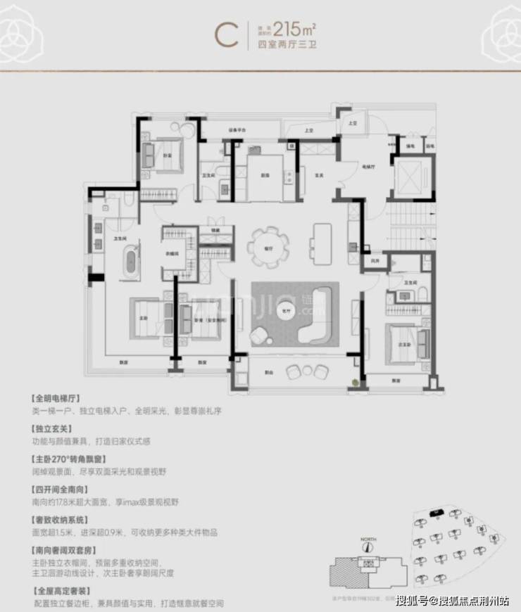 建面约145㎡四房两厅两卫有边厅和南厅两种选择,部分户型主卫镜柜内嵌了美妆冰箱,厨房配备博世四件套及两台嵌入式冰箱;建面约178㎡ 四房两厅三卫最大亮点在于部分房间可设计为双套房,并拥有多个270°观景角;建面约215㎡楼王大宅位于社区中轴,仅34席,稀缺性极高。