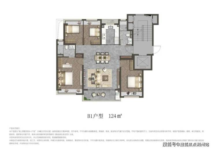 以建面约124㎡四室洋房为例,超大餐客巨厅、独立主卧套房、独立书房,户型布局媲美平层别墅。可分可合厅房、全卧飘窗巧思,延伸日常生活的想象。