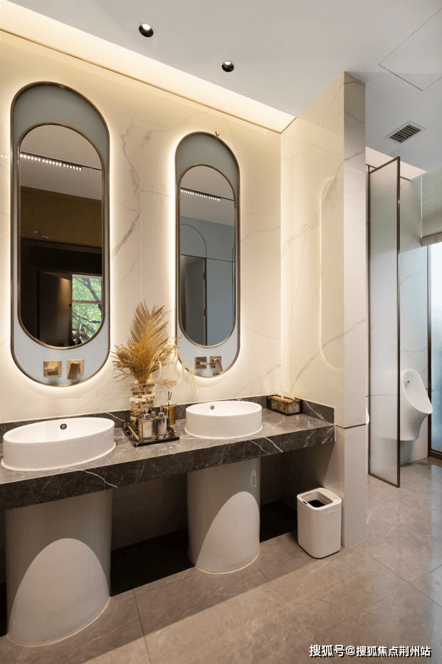 卫生间延续空间整体设计格调,于细节处彰显设计巧思:隔断以材质色彩明确功能分区,女卫采用温润的粉色木饰面,男卫选用沉稳的蓝青色木饰面,形成雅致对比。墙面铺设大规格陶瓷大板砖,搭配深灰色石材台面的独立洗手台,在简约中传递精致质感,与售楼处整体美学理念相契合。