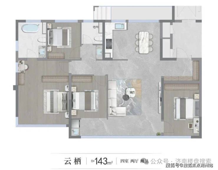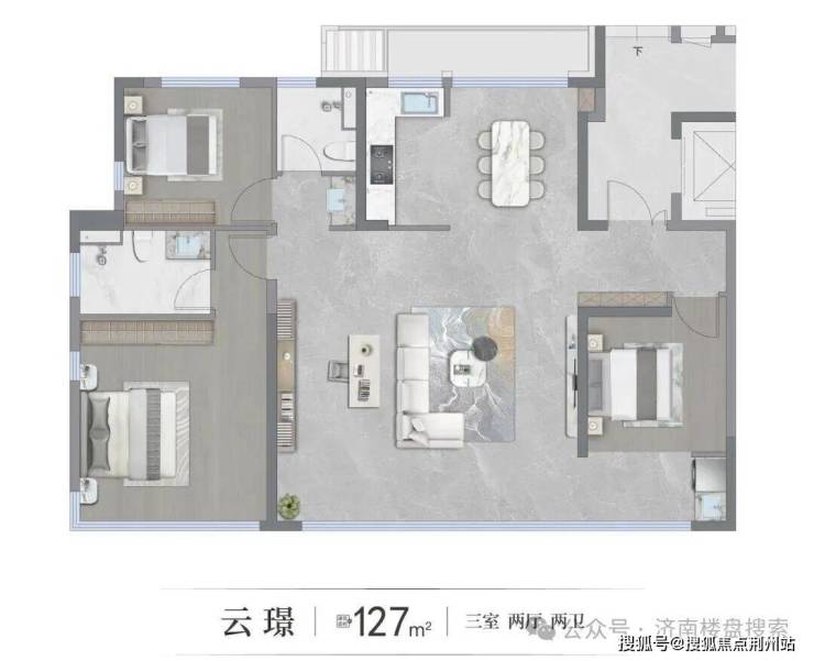 项目小高层户型有127/143㎡;洋房有127/143/169/189㎡。首层带独立庭院;顶跃带空中庭院,有超大露台。