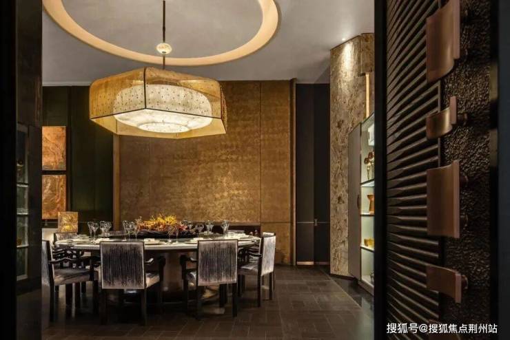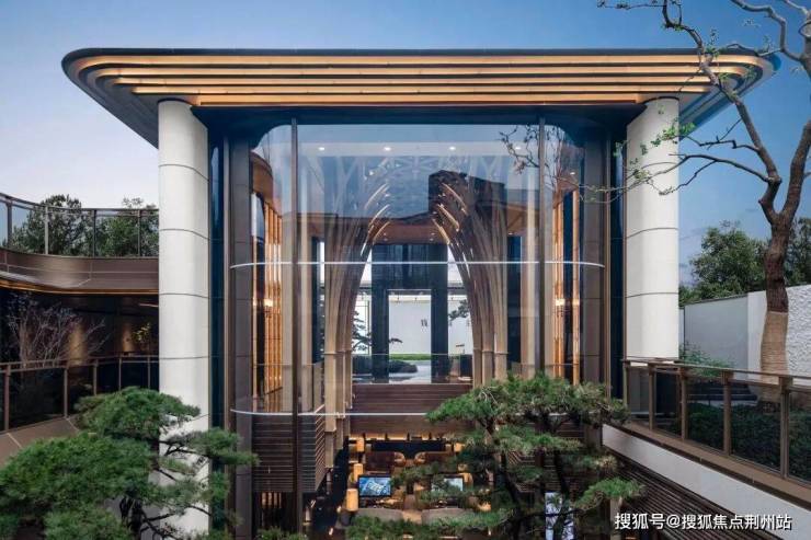 进入宽广的大厅,抬高后带来极致的纵向挑空,你感受着奢华礼堂般的氛围,眼帘里又是精巧的东方榫卯与斗拱制式的穹顶细节,高山流水的画卷映在前方的大面积玻璃中。
