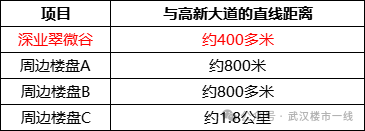 深业翠微谷到高新大道的直线距离仅约400多米。再看区域内其他四代楼盘,到高新大道距离约700米以上,甚至1.5公里开外。
