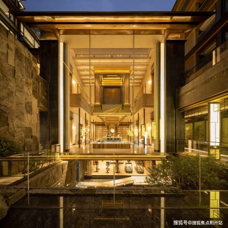 主入口横向延展面达90M,门头采用庑殿形制,以大规格金色金属对称式屋顶,强化归家礼序,立面以透光碧玉奢石呼应“天青”之美,结合星空闪耀的流水景墙,打造“光之水韵”,共同还原古运河形态;中轴景观以“引水入园、枕水而居”为核心理念,引入一条运河入园、联通整个中心轴线,从西而动,打造一轴四处运河之源的场景;在入口位置结合下沉庭院打造会所、健身、泳池、私宴等配套功能,形成多维立体的共享空间。