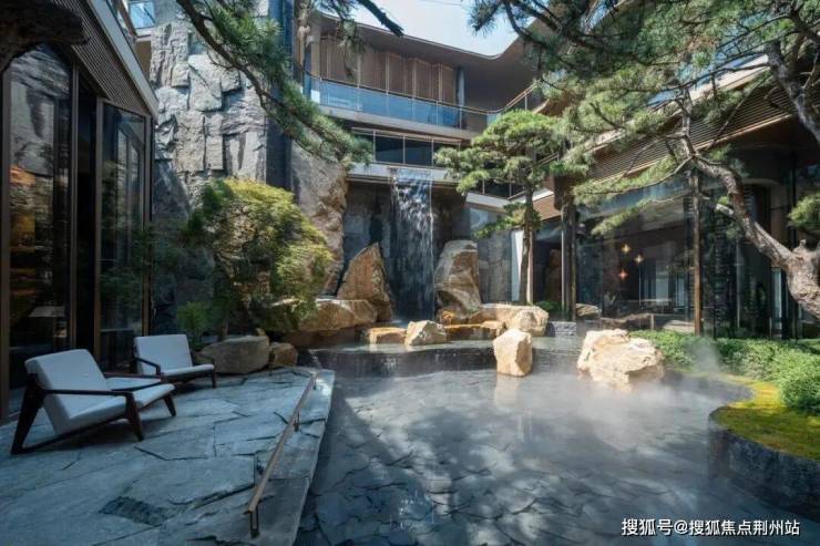 经过入口处“松间画屏”借鉴郭庄归家障景手法打造的小院落景观空间,离开融合六和塔、钱塘江潮涌、江南园林拱门等造型元素,所构筑起的“云卷云舒”的诗意场景,便可看见“银河叠水”从北宋名画《溪山行旅图》中汲取灵感,以叠山、理水、松林、亭台打造的“动静相宜”的立体山水画卷:松林环绕间,约15米“双飞瀑”从层叠中国黑石皮的缝隙倾泻而下,以经过精密计算控制的约1.5m/s流速撞击片岩、落入深潭,激起蒙蒙水雾,重现画中“云气缭绕”的仙境,营造“虽由人作,宛自天开”的园林造景效果。“月映听泉”则将景观社交化,置身于压檐的坡屋顶之下的下沉式卡座中,可将对岸流水纳入视野,实现人与自然的物我合一。四时四院,服务多个功能空间,让生活与院子紧密相连。