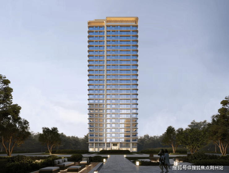 楼栋冠顶采用以玻璃、铝板与墙体结合为主的重檐设计,简约流畅,金色的装饰线条及飘板,质感满满,呈现珺石如玉的立面美学,高窗墙比配置打造高颜值立面,最大化满足业主在室内的观景效果。