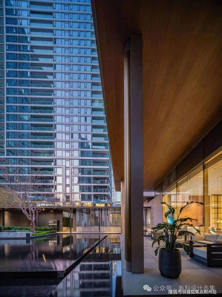 立面设计汲取长江流动水韵的灵感,以风帆造型营造出极具辨识度的塔冠设计。定制的鎏金腰线既以「鎏光织锦」雕琢高定美学立面,更借起伏曲线暗合奔涌江潮之势——将长江「云奔潮涌、勇立潮头」的进取精神,凝练为武汉瑞府的城市精神图腾。