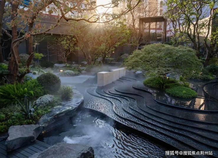 林涧溪谷:以300㎡镜面水为核心,周围环绕叠级景观,水面如镜子般倒映着天空、绿植与石材,分不清哪里是实景,哪里是倒影。