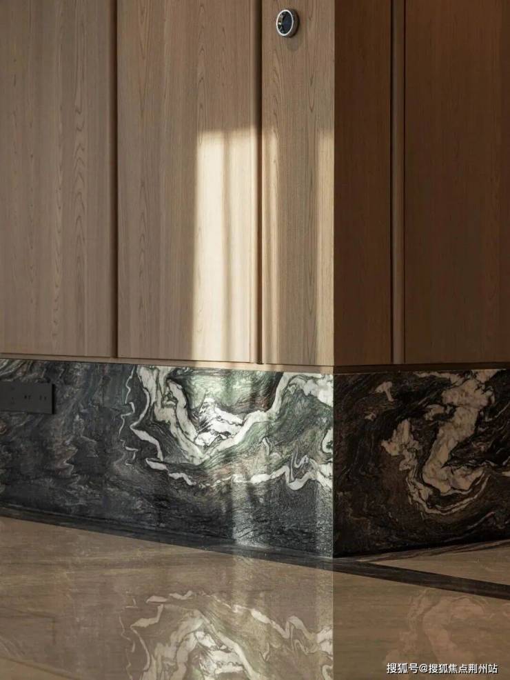 卫浴空间采用木纹铝板,平衡木质温润触感与防潮耐用性能;紫山水大理石从地面延伸至墙面,更创新嵌入客厅吊顶,卧室背景墙则以珍珠鱼皮与 贝母工艺点缀,兼顾实用与艺术格调。